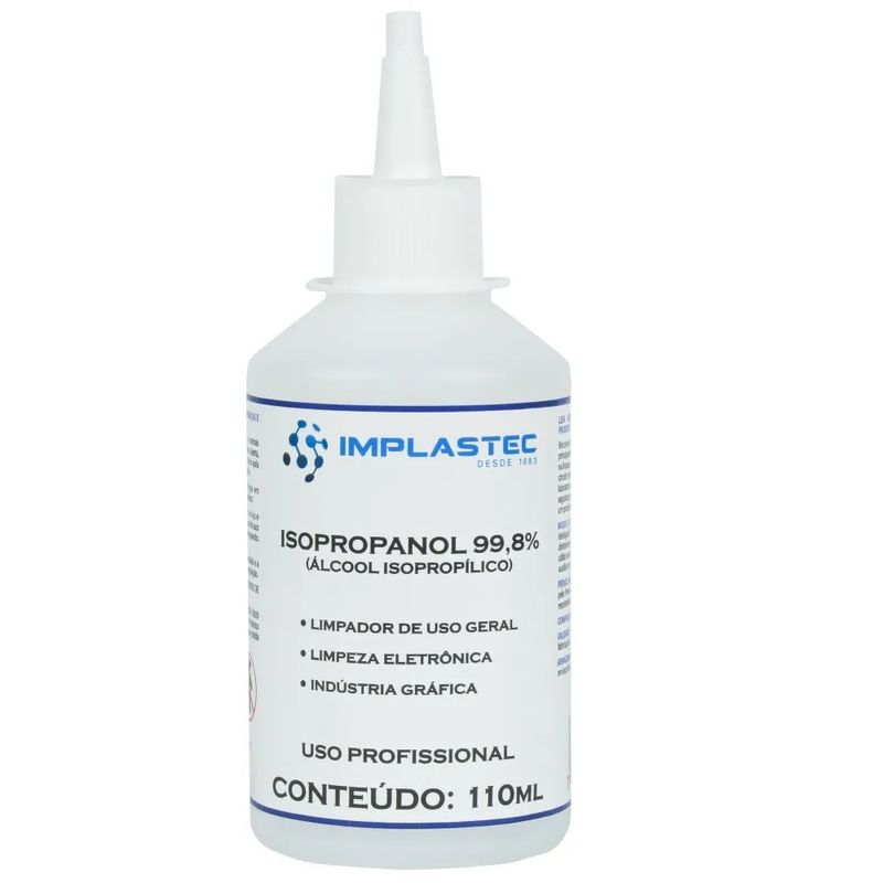 Álcool isopropílico (99,8%) para utilização na limpeza de placas e componentes eletrônicos, fraco com 110ml e bico dosador.