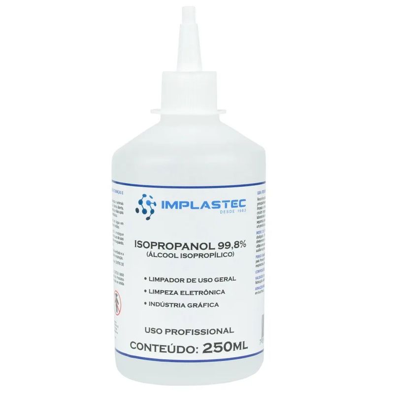 Álcool isopropílico (99,8%) para utilização na limpeza de placas e componentes eletrônicos, frasco com 250ml e bico dosador.