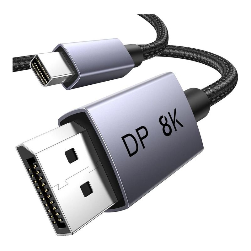 Cabo de vídeo, interface mini DisplayPort (macho) para DisplayPort (macho), suporta resoluções 8K a 60Hz e 4K a 240Hz, cabo trançado.