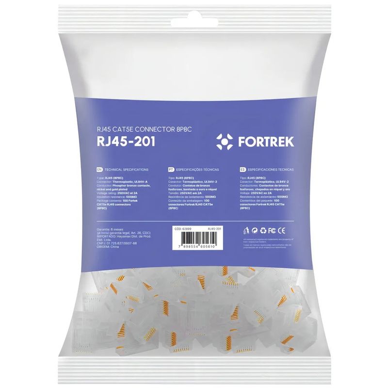 Conector do tipo RJ-45 para cabo de rede, pacote com 100 unidades.