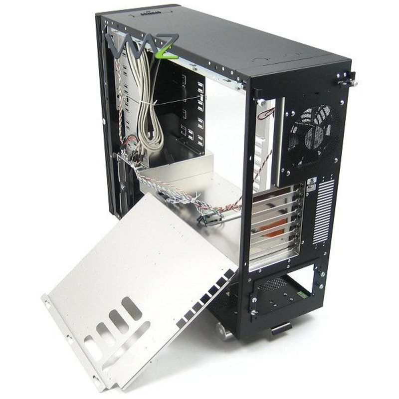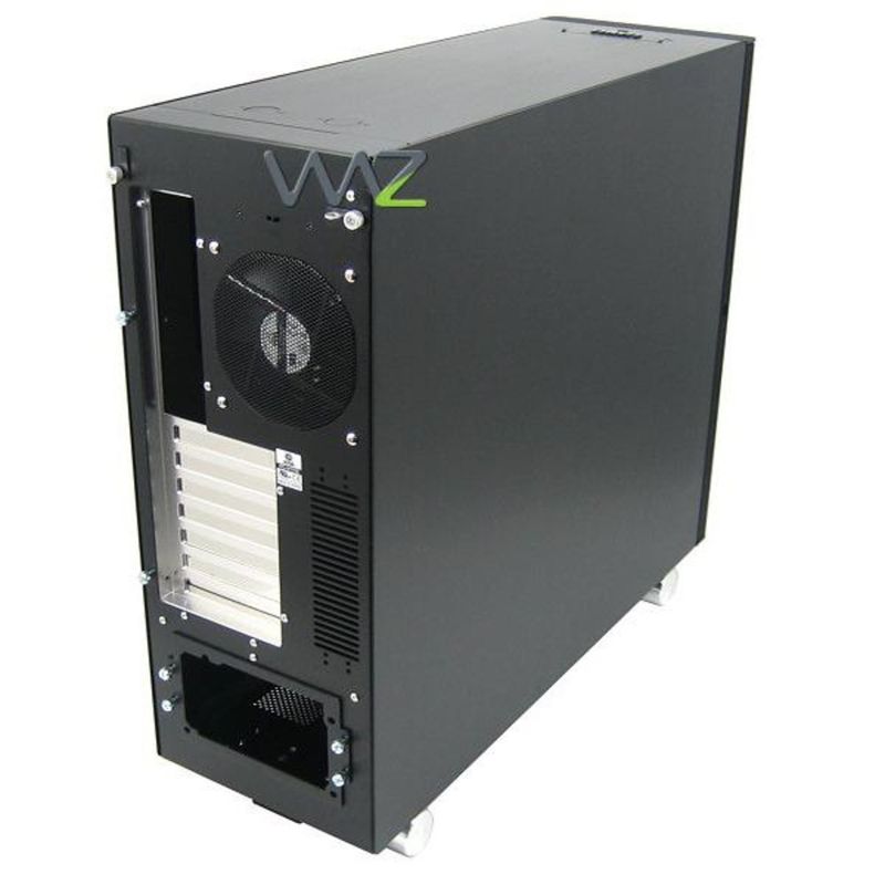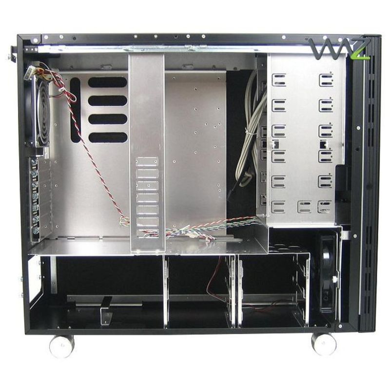Gabinete Super Torre ATX, 5 baias de 5,25pol (externas), 6 baias de 3,5pol (internas), três ventoinhas inclusas (duas de 12cm e uma de 14cm), conectores no teto (USB, Firewire, e-SATA e Áudio), suporta placa mãe E-ATX / ATX / Micro ATX, porta frontal com trava por chave, acabamento acústico.