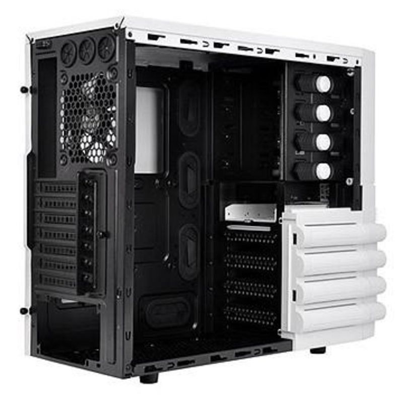 Gabinete Torre ATX, 4 baias de 5,25pol (externas) + 5 baias de 3,5pol / 2,5pol (internas e de fácil acesso), conexões no frontal (2x USB v3.0 e Áudio), suporta placa mãe ATX / Micro ATX, 7 slots de expansão.