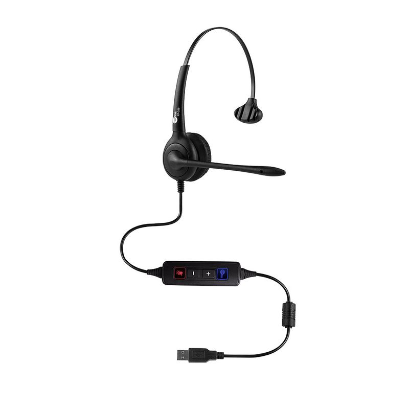 Fone de ouvido mono (1.0), alça com ajuste de altura, conexão USB, microfone integrado com ajuste de posição, controle de volume (p/ o fone de ouvido) e switch de mudo (p/ o microfone).