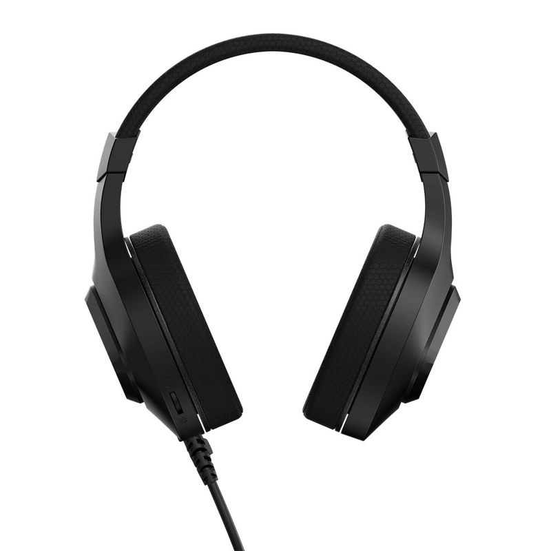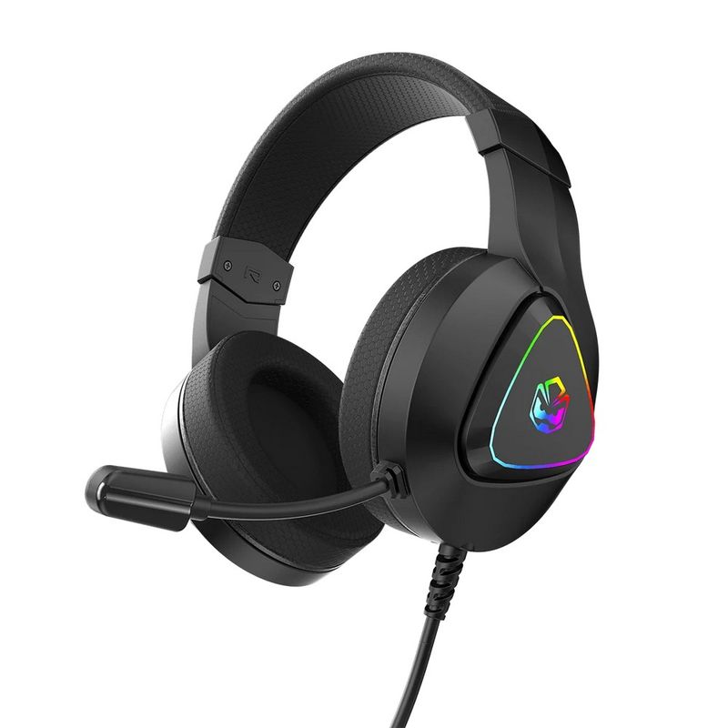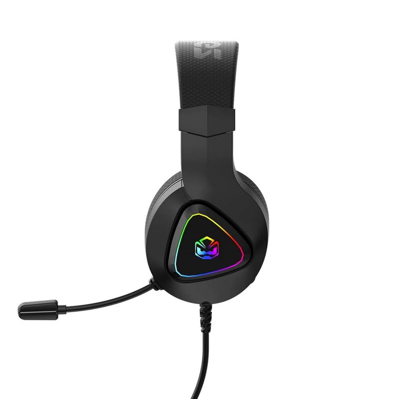 Fone de ouvido estéreo (2.0) com conexão USB, fones almofadados com design circumaural, drivers de 50mm e iluminação RGB, microfone integrado.