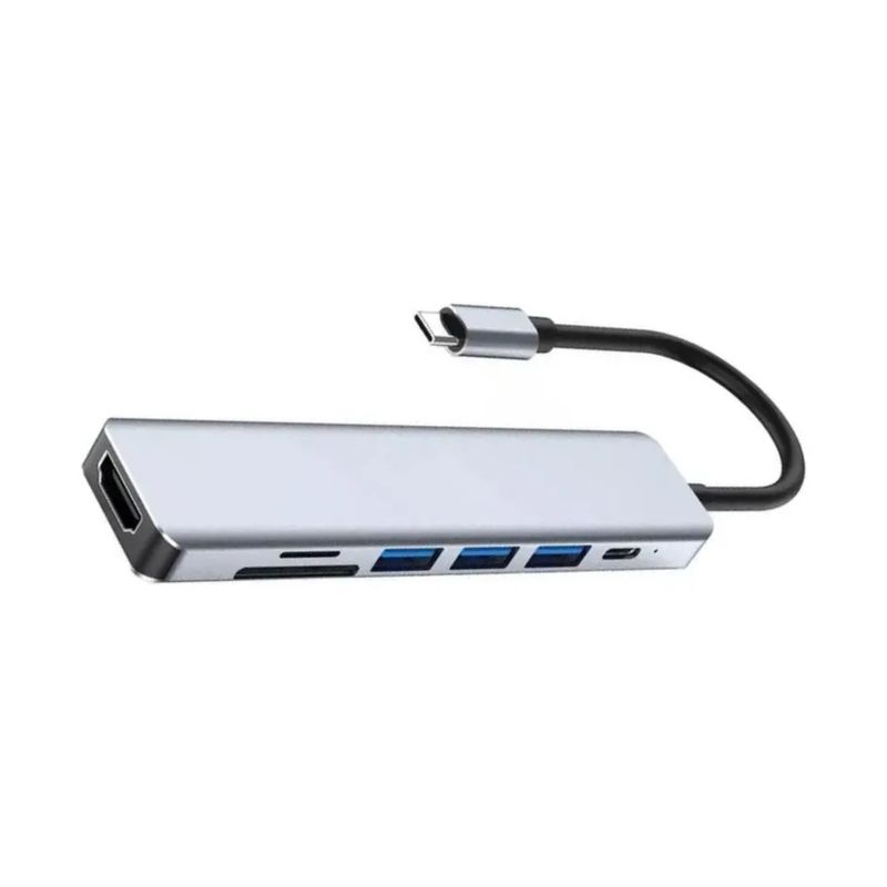 Hub USB v3.0, interface USB Tipo-C, porta HDMI, 3x portas USB Tipo-A, 1x USB Tipo-C Power Delivery, 1x Leitor de Cartão SD/TF.