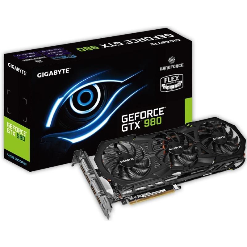 Placa de vídeo com GPU NVIDIA GeForce GTX 980 (1,178GHz), 4GB de memória GDDR5 (256bits / 7,01GHz), interface PCI Express 16x v3.0, conexões DVI-D + DVI-I + HDMI + 3x DisplayPort, suporta até 4 displays simultaneamente, suporta as tecnologias NVIDIA SLI (4-way) e 3D Vision Surround, modelo c/ Overclock de fábrica, sistema de refrigeração Gigabyte WindForce 3X.
