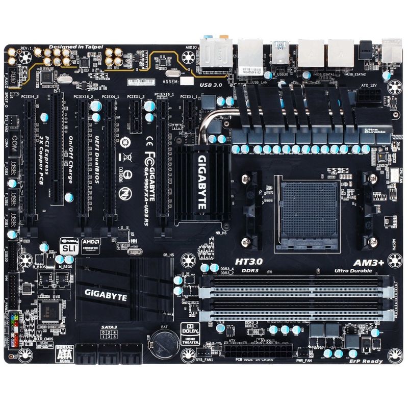 Placa mãe para um processador AMD FX, Phenom II, Athlon II e Sempron (socket AM3+), AMD 990FX + SB950, Dual Channel DDR3 2.000MHz (32GB), quatro slots PCI Express 16x (CrossFireX / SLI / v2.0), SATA 6Gb/s RAID, áudio de 8 canais (Realtek), rede Gigabit (Realtek), USB v2.0, USB v3.0, interfaces SATA 6Gb/s / e-SATA / RAID.