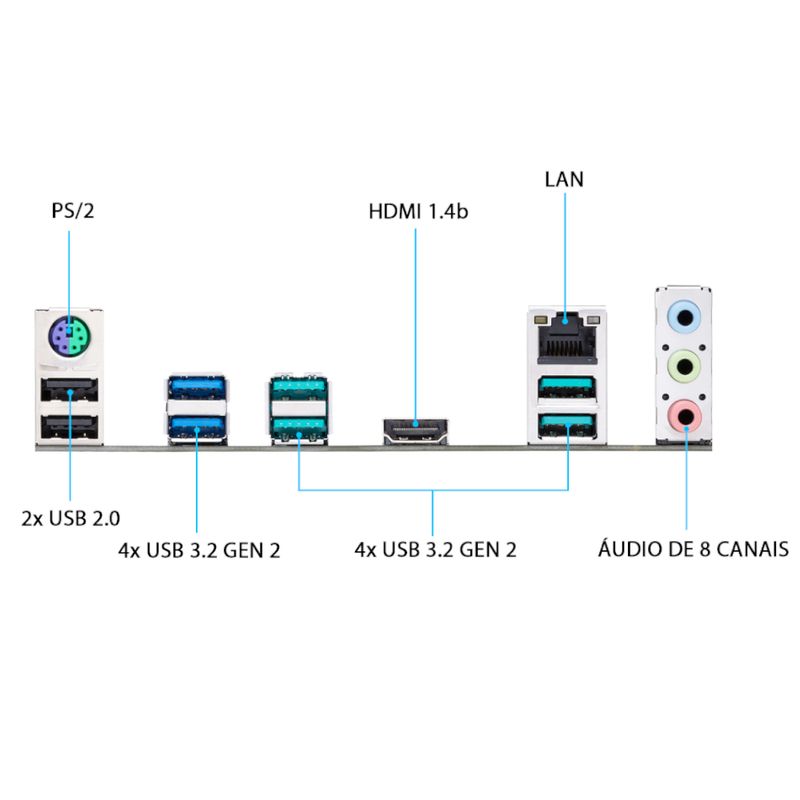 Placa-Mãe padrão ATX, socket AMD X570, suporta processadores Ryzen série 2000/3000, suporta memória DDR4 4.400 (O.C.), processador gráfico integrado AMD, conexão HDMI, rede Ethernet Gigabit 10/100/1000, SATA III, M.2, USB v3.2 Tipo-A, áudio 7.1, PCI Express 16x, PCI Express 1x, PS/2, S/PDIF, iluminação LED RGB.