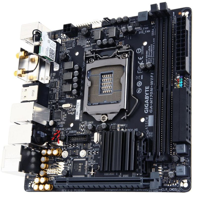 Placa mãe para um processador Intel Celeron, Pentium e Core i3 / i5 / i7 (LGA1151), chipset Intel H170, conexões DVI-D + HDMI, Dual Channel DDR4 2.133MHz (32GB), um slot PCI Express 16x (v3.0), SATA 6Gb/s / RAID / Express / M.2, áudio de 8 canais, duas redes Gigabit (Intel), rede sem fio (11a / b / g / n / ac), Bluetooth v4.2, USB v3.0, Mini ITX.