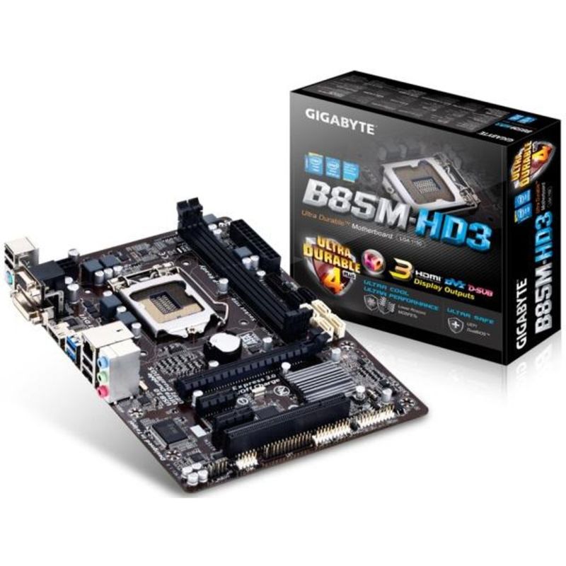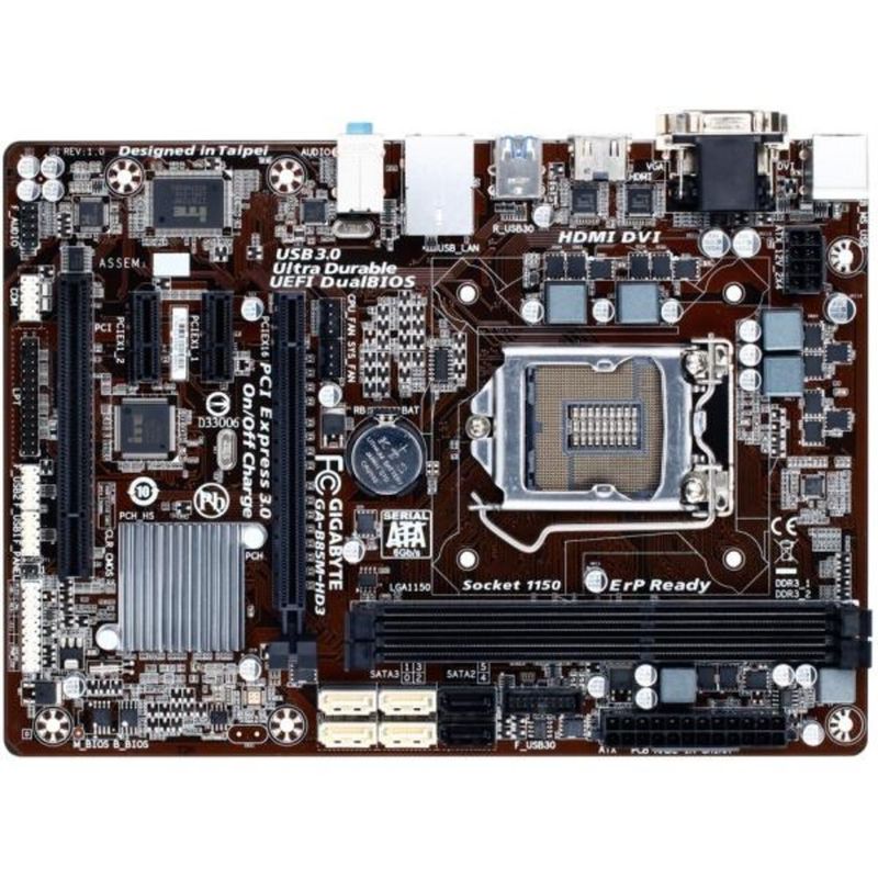 Placa mãe para um processador Intel Pentium, Core i3 / i5 / i7 e Xeon (LGA1150), chipset Intel B85, conexões VGA, DVI e HDMI, Dual Channel DDR3 1.600MHz (16GB), um slot PCI Express 16x (v3.0), SATA 6Gb/s, áudio de 8 canais, rede Gigabit, USB v2.0, USB v3.0.