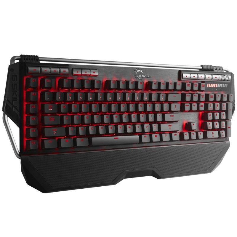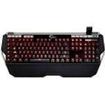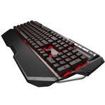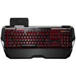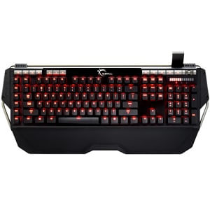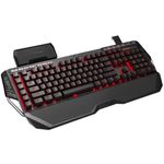 Teclado do tipo mecânico (switches Cherry MX Red) com interface USB v2.0, layout Americano (Inglês), 104 teclas + 18 teclas extras (Multimídia + Trava da tecla Windows), porta USB para periférico, tecnologia anti-ghosting, chassi de alumínio, pezinhos retráteis (no frontal e na traseira) para ajuste de altura / inclinação, iluminação vermelha.