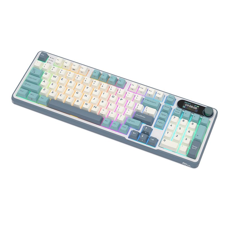 Teclado mecânico 96%, interface USB Tipo-A + Bluetooth + 2.4GHz, switch Brown (removíveis), layout americano, tela LCD, iluminação LED RGB.