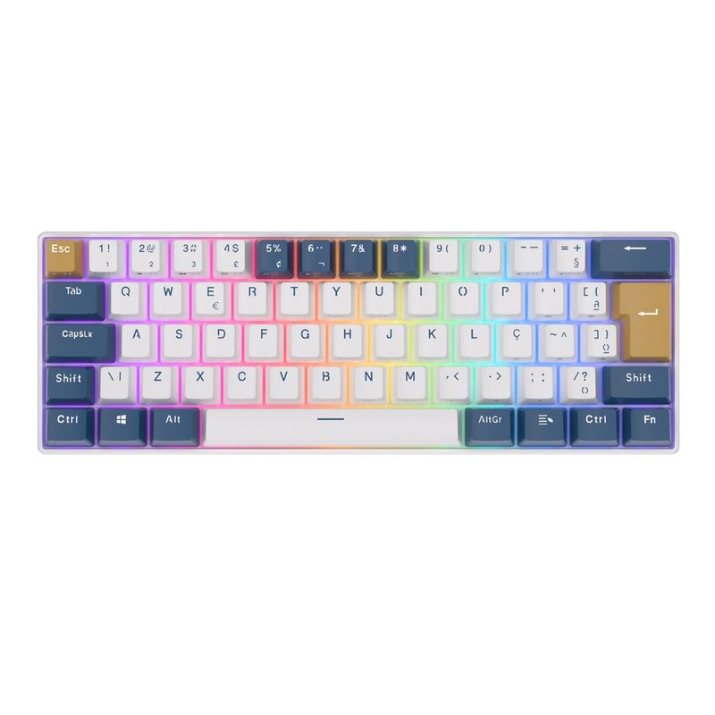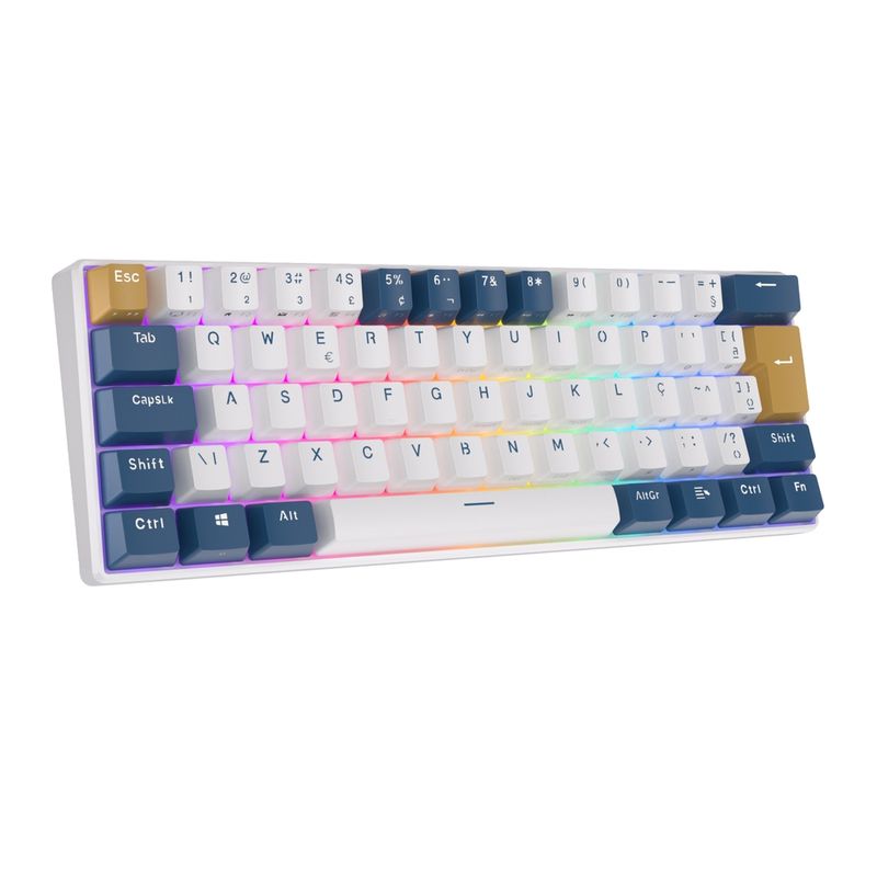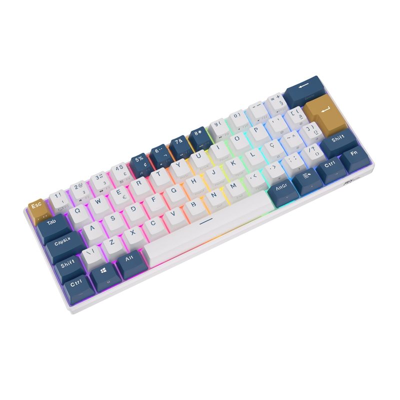 Teclado mecânico 60%, conectividade plug & play USB, switch Brown (removíveis), teclas ABS Double shot, iluminação LED RGB.