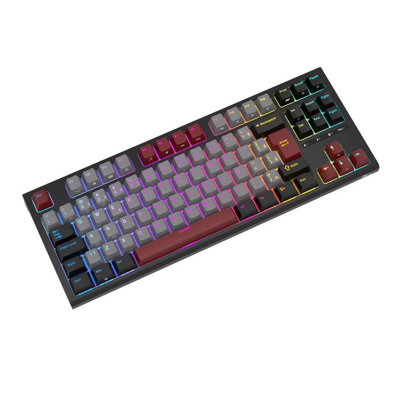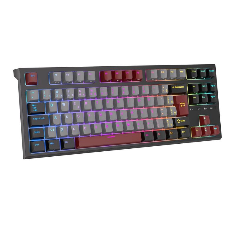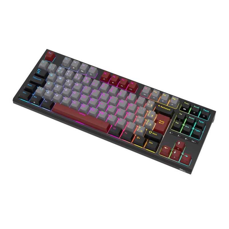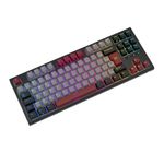 Teclado mecânico, interface USB Tipo-A, TKL 75%, switch Red (removíveis), layout ABNT2 (brasileiro), teclas PTB Doubleshot, iluminação LED RGB.