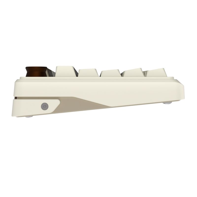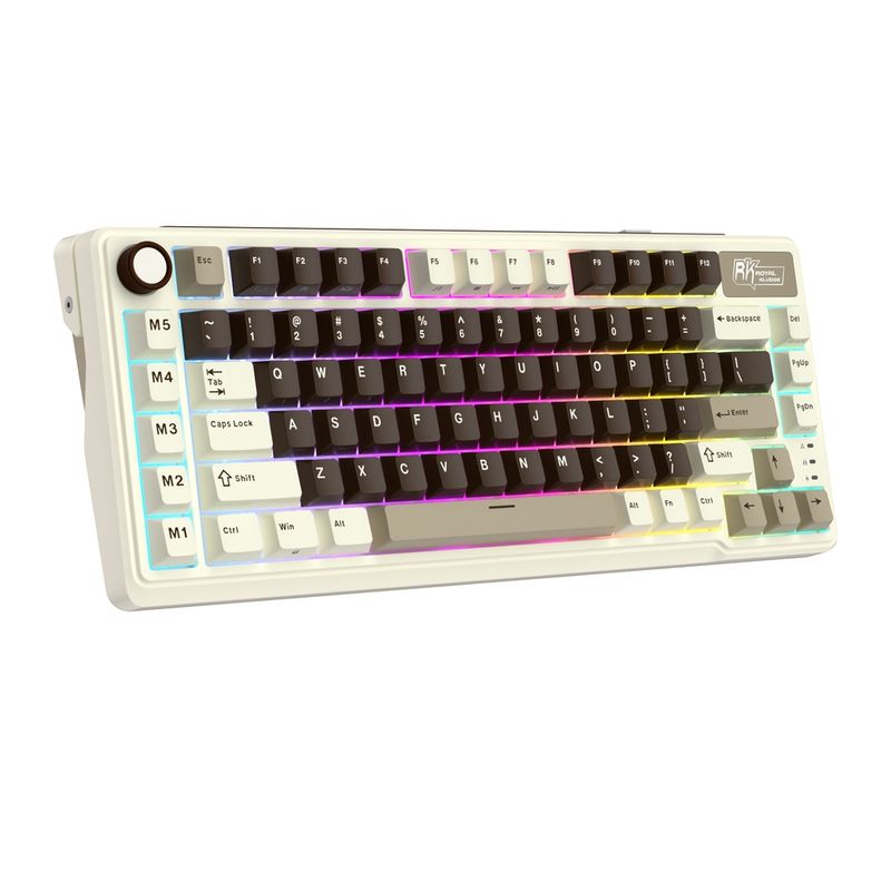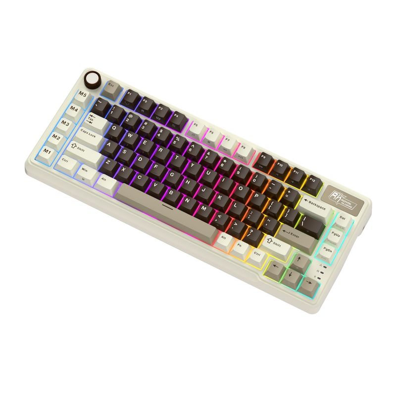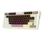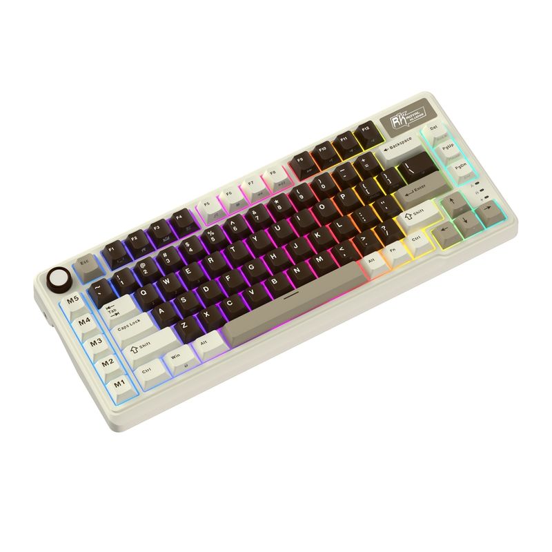 Teclado mecânico 75%, conexão USB Tipo-A + Bluetooth + 2.4GHz, switch Cream (removíveis), layout americano, teclas macro, iluminação LED RGB.