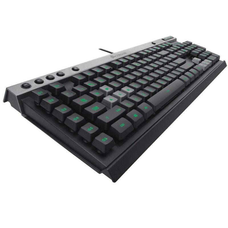 Teclado com interface USB v2.0, layout Brasileiro (Português), 104 teclas + 7 teclas extras (Multimídia + Mudo (p/ áudio) + Trava da tecla Windows), tecnologia anti-ghosting, chassi de alumínio, pezinhos retráteis (na traseira) para ajuste de inclinação, iluminação personalizável.